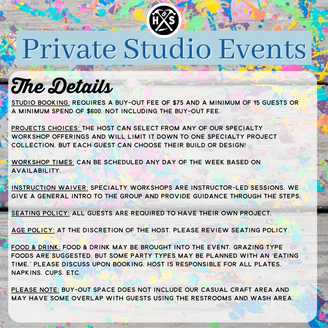 Host a private workshop with your friends, co-workers or family in our studio! Choose from a variety of DIY projects for your group and pick a date and time that works for your group’s schedule.